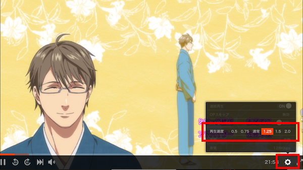 - 倍速再生、連続再生、オープニングスキップなどの設定は再生画面の右下にある歯車マークから